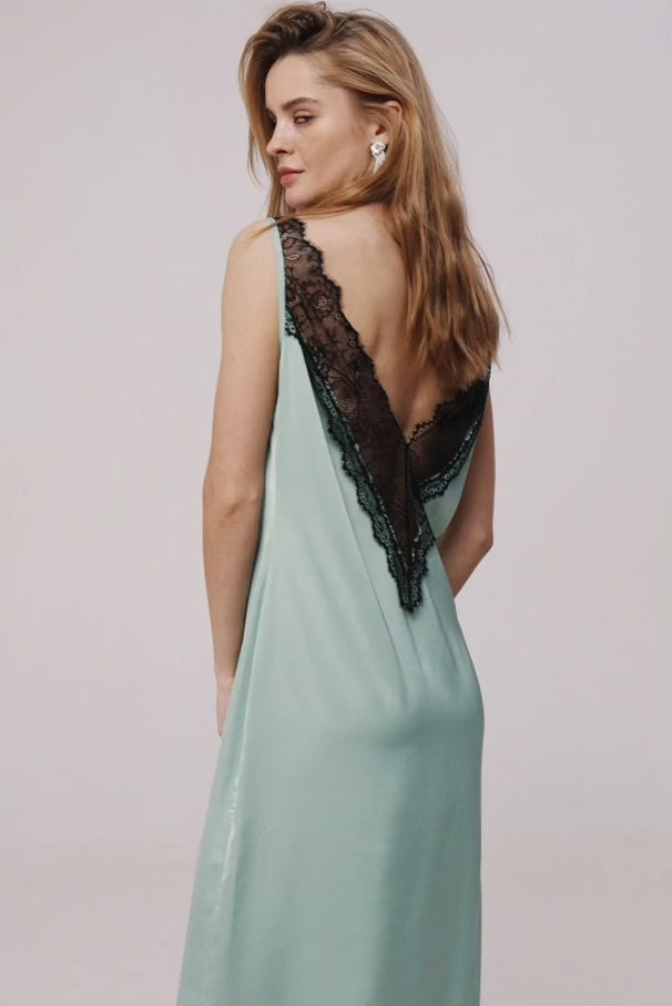 A midi silk dress with a V-neckline, adorned with a lace insert in the center. Lace inserts are also placed along the edges of the dress. Made from high-quality silk, adding elegance and lightness to the piece.
