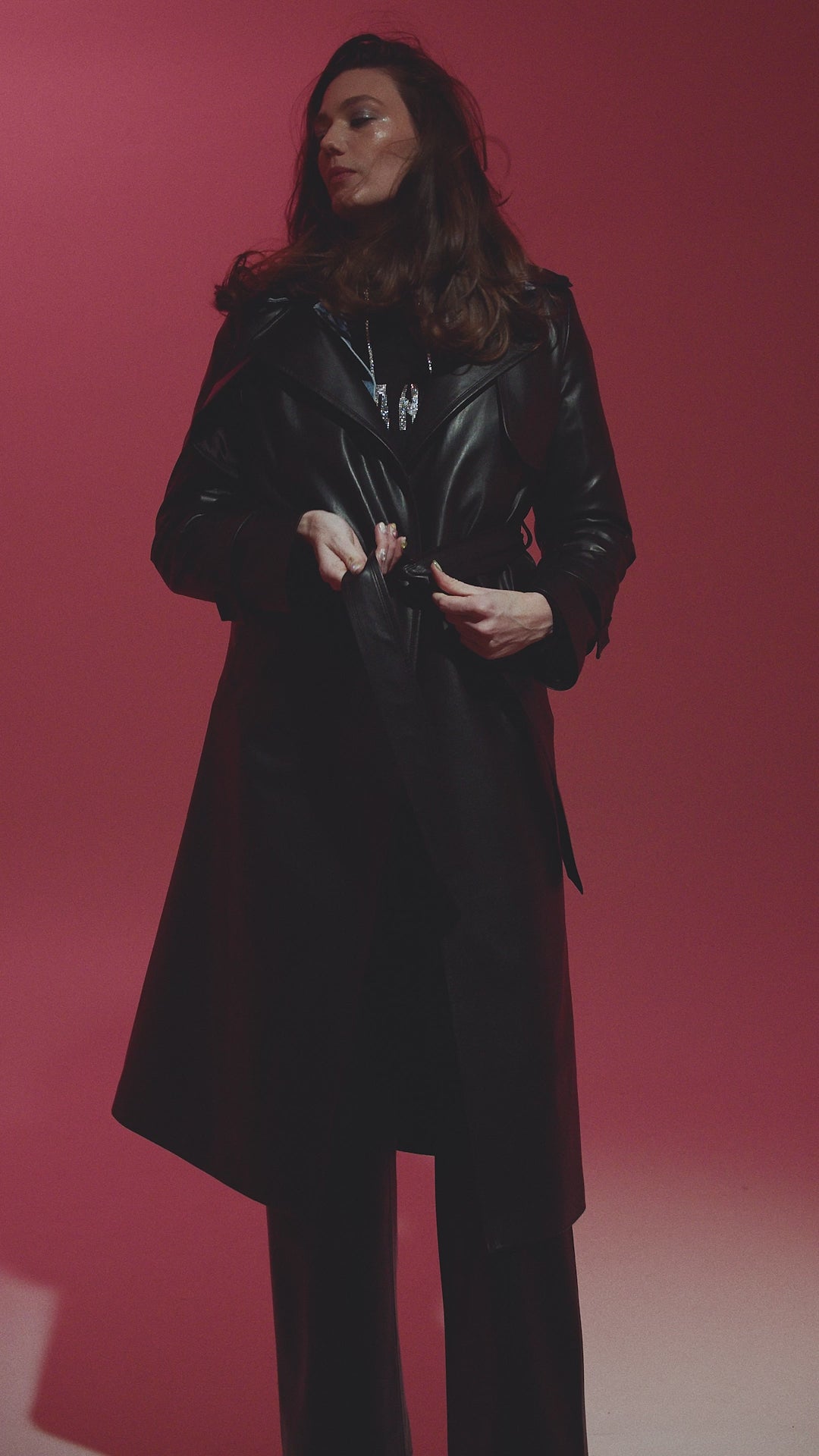 A long black faux leather trench coat with a classic silhouette. It features a wide notched collar, a double-breasted design, and a belt accentuating the waist. The sleeves are finished with strap-detailed cuffs, while the back vent ensures ease of movement. A sleek and stylish choice for a modern wardrobe.